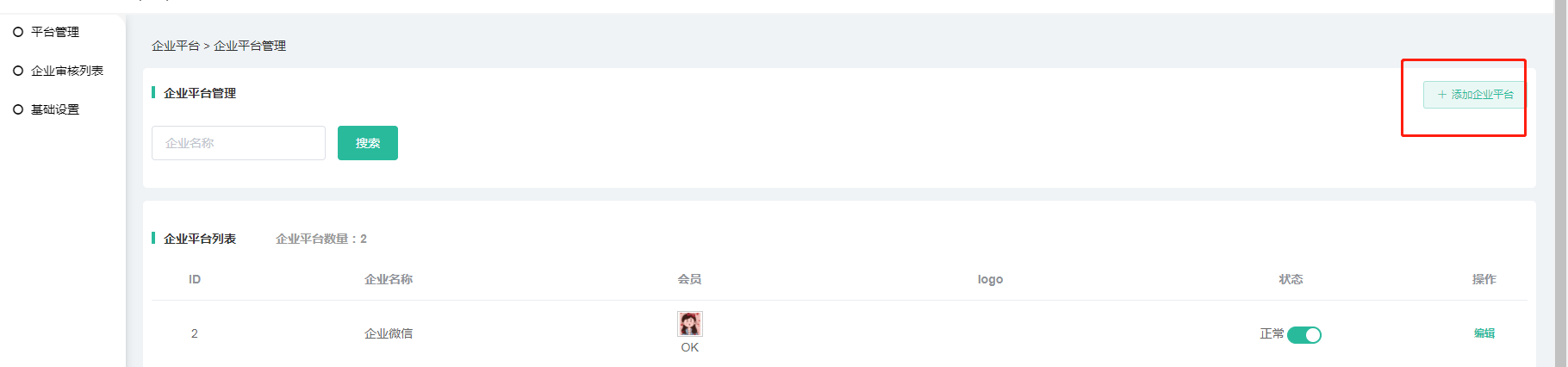 设置基础设置-审核-或添加企业-企业名称和权限