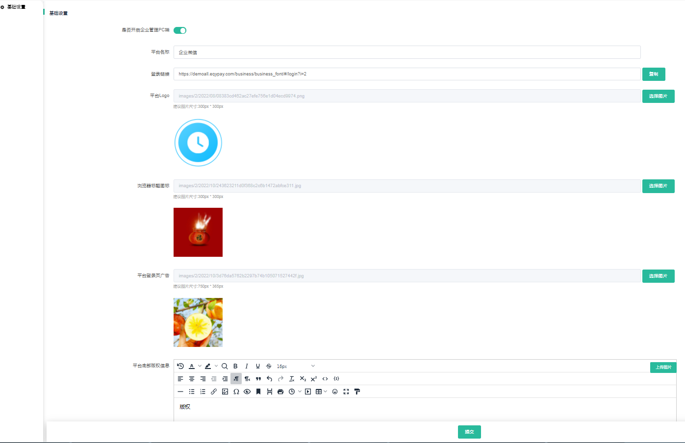 • 平台底部版权信息:企业管理PC端底部显示的版权信息,可自定义设置,如平台名称、地址、备案号等。