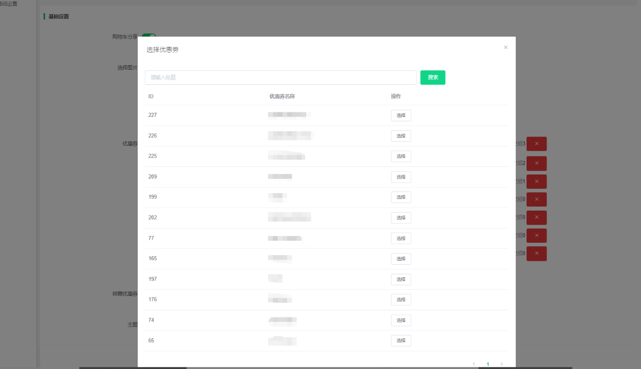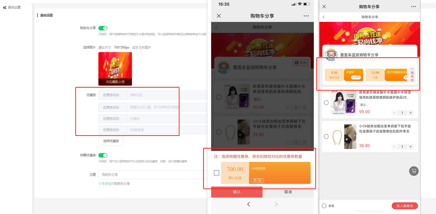 转赠优惠券:开启后,用户在分享购物车可以选择自己的优惠券(会员自己领取的所有平台优惠券)、张数、进行转赠优惠券