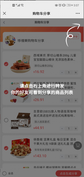 2、点击右上角-分享好物。后台不开启购物车分享则不显示此选项。