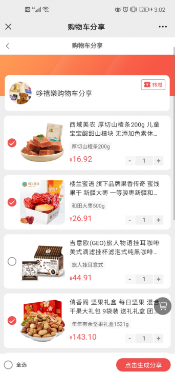 购物车分享:开启后,用户前端购物车页面显示分享好物按钮,可以选择购物车商品生成购物单进行分享!