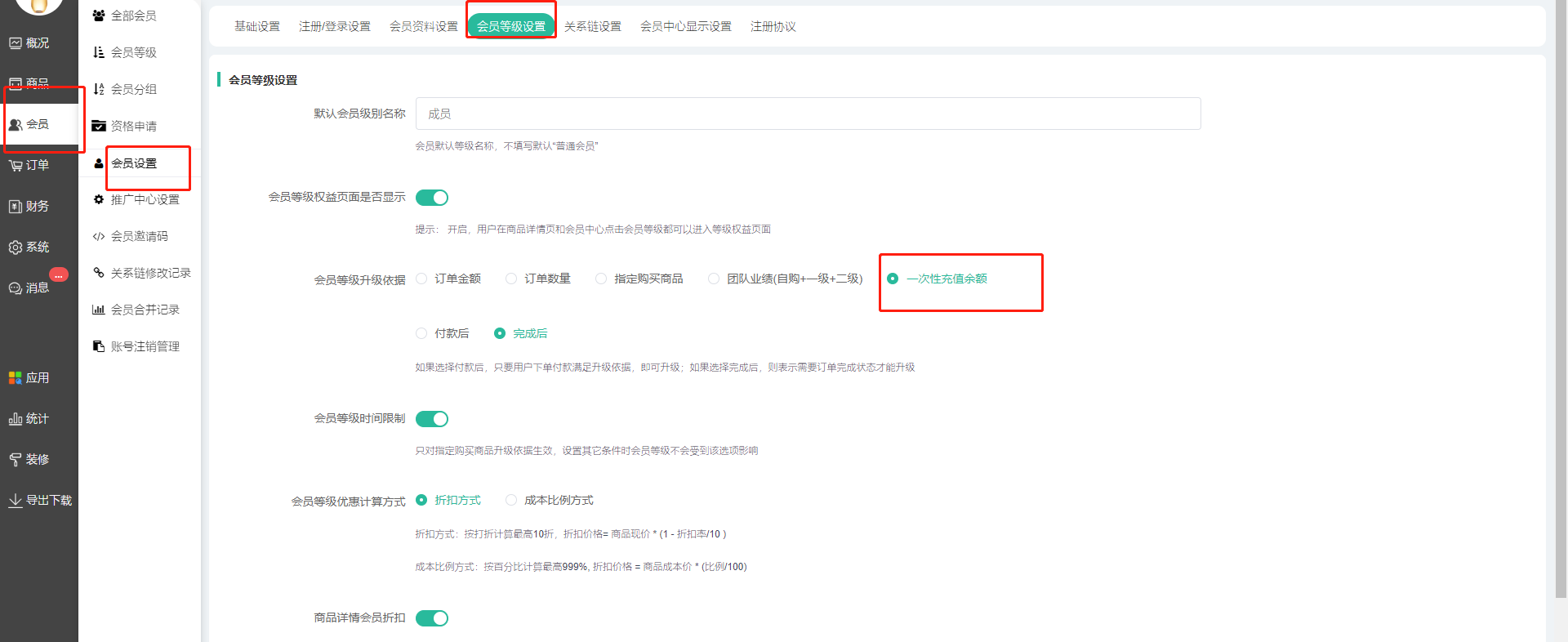 1.会员设置的升级条件需要设置成为一次性充值余额
